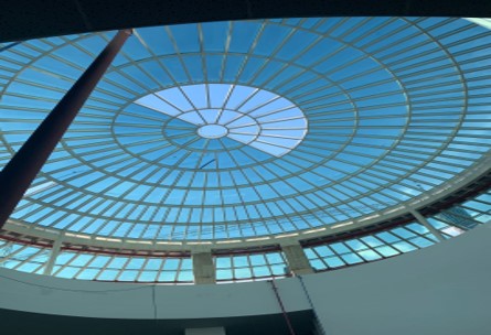 其中,广州美术馆约2万平方米的光伏幕墙面积主要分布在立面和屋面,光伏组件发电项目总发电228.51kWp,可以说,这朵“水中盛放的英雄花”也是一朵名副其实的“绿色环保之花”。立面光伏幕墙的钢结构桁架由爪件控制上下左右四块光伏玻璃,爪件自桁架中心向四周无规律发射,由于现场钢桁架不具备三维扫描建模和全站仪打点的条件,如何保障施工定位准确是项目的核心重难点。而屋面光伏幕墙覆盖北区和东区各16个区域的排布,项目部需克服测量放线工作量大、精度要求高,工程平面弧度、折边、交叉幕墙系统等诸多施工困难,以达到最佳的施工效果,完美还原设计初衷,将光伏幕墙的节能效果达到最佳。
