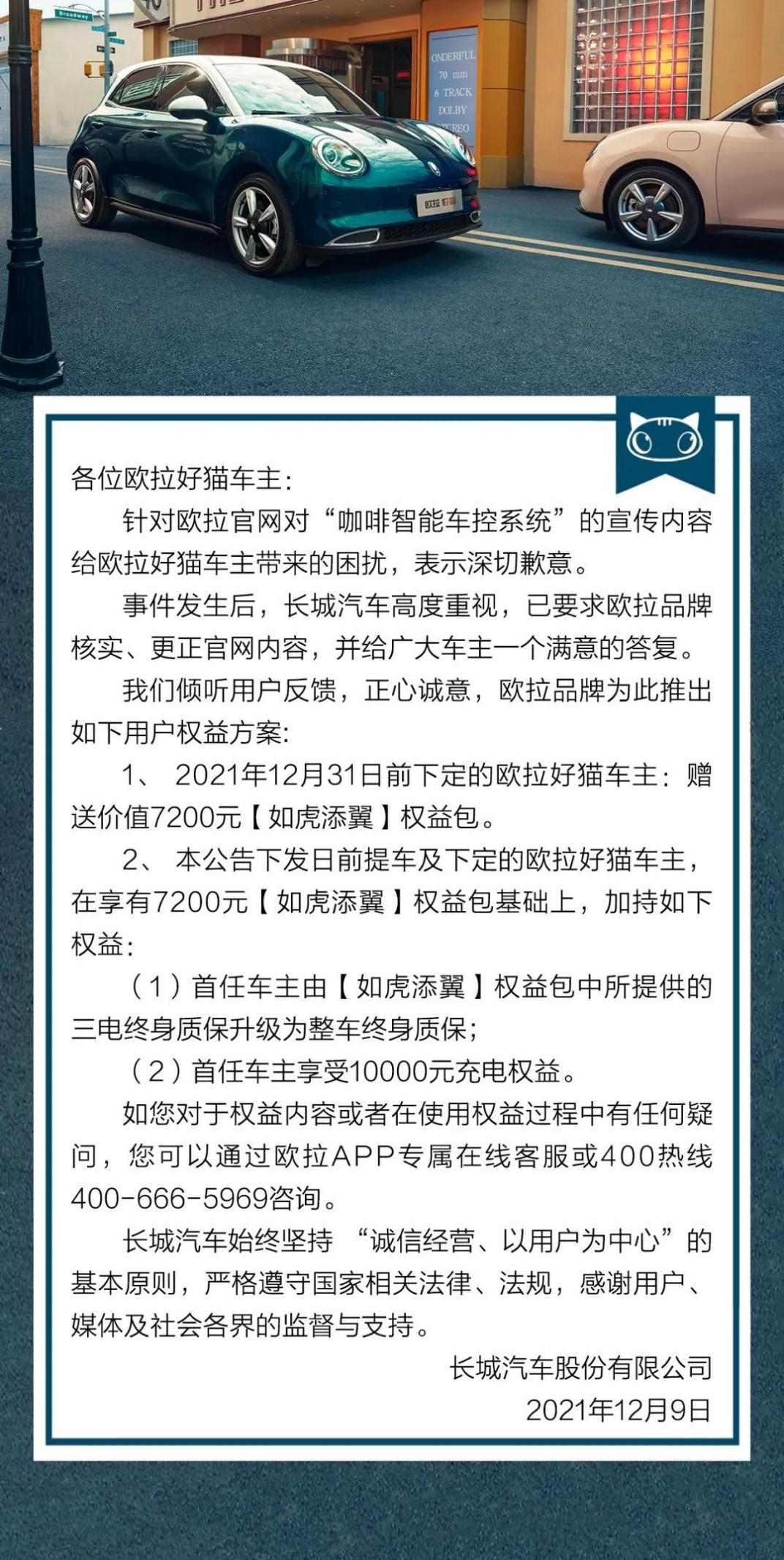 欧拉官方最新一版的补偿也是诚意满满,只要是在2021年12月31日之前下定的欧拉好猫车主,赠送价值7200元的【如虎添翼】权益包。而本公告下发日前,即12月9日前提车或下定的欧拉好猫车主,在享有7200元【如虎添翼】权益包加持上,还能得到【如虎添翼】权益包中所提供的三电终身质保升级为整车终身质保、首任车主享受10000元充电权益的惊喜。