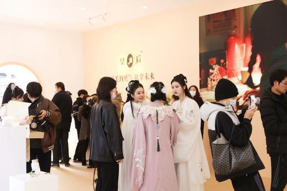 在体验馆开放期间,除了络绎不绝的参观者,现场还有诸多国风博主的身影穿梭期间,例如百万级国风博主司音儿、陈错啊等。她们身穿一袭唯美汉服,与画中的东方美人邂逅对望,俨然一幅古今相映的诗画,也成为了馆内的一道亮丽风景。