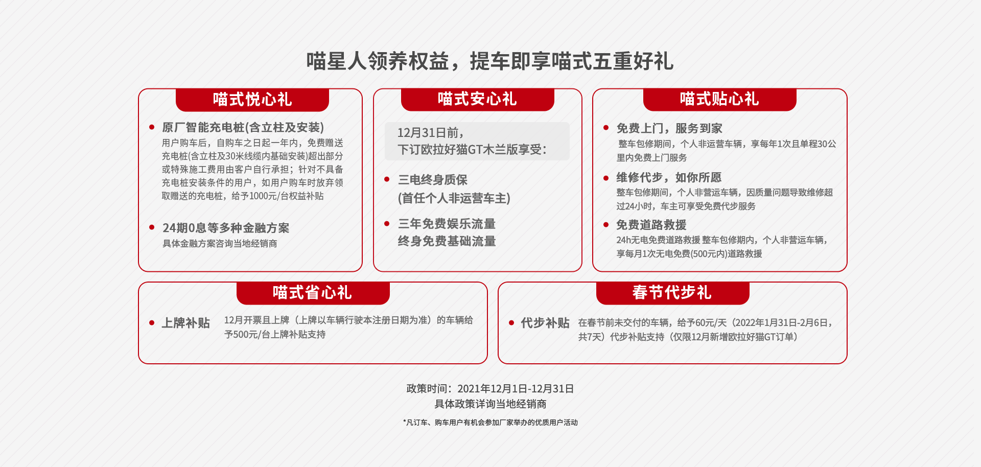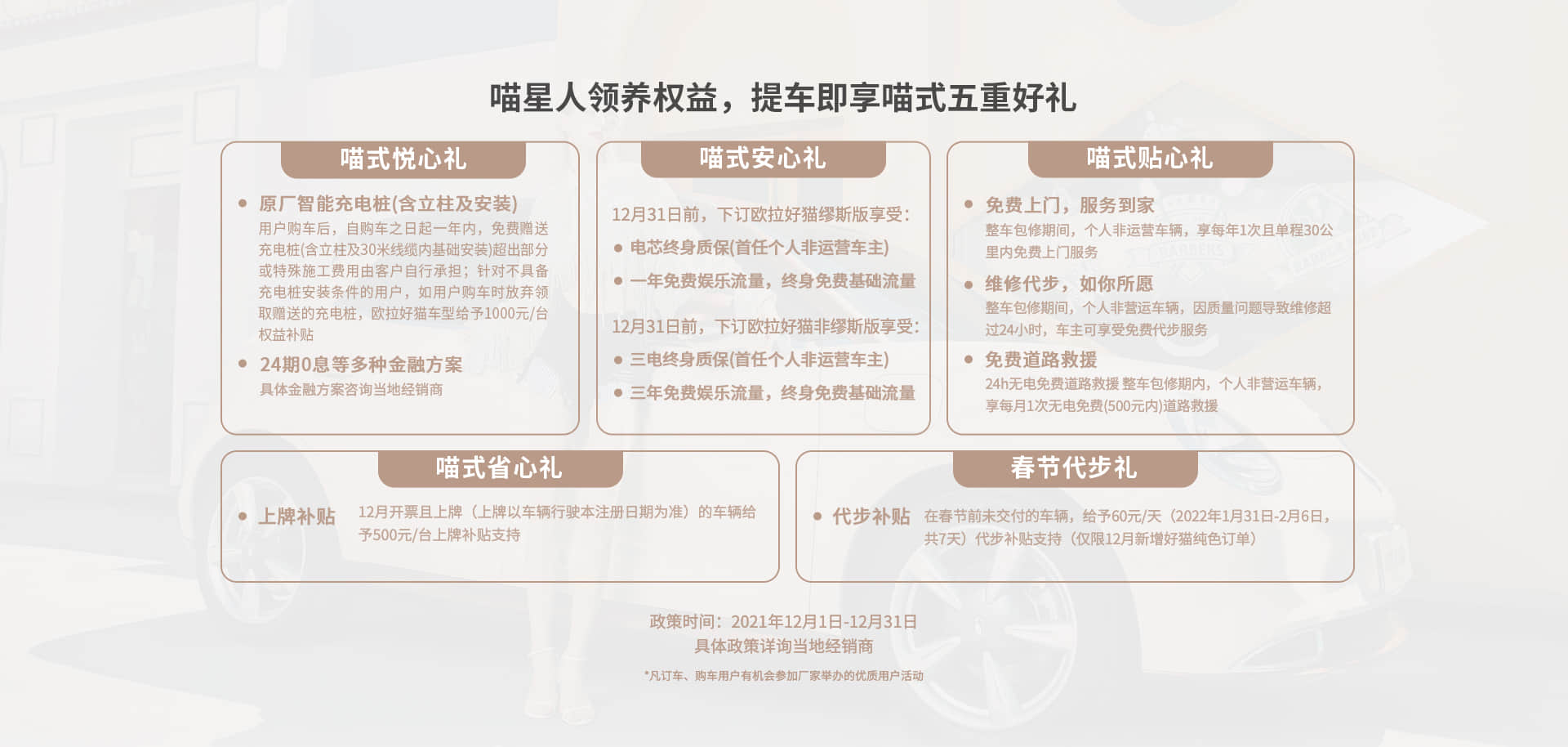 其中,最引人关注的是喵式省心礼和春节代步礼:12月开票且上牌的好猫和好猫GT木兰版(上牌以车辆行驶本注册日期为准),给予500元/台的上牌补贴;在春节前未交付的车辆,给予60元/天的代步补贴支持(2022年1月31日——2月6日,仅限12月新增的好猫纯色车型和欧拉好猫GT订单)。