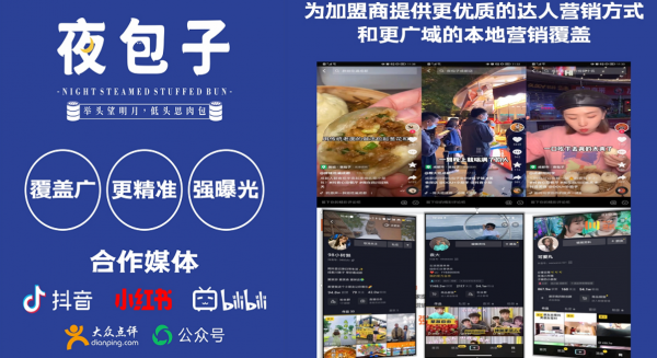 “夜包子”品牌官方与当下百度、360、搜狗、神马、腾讯今日头条等抖音几十个网络媒体及全国美食大人强力合作,为加盟商提供更好、更广域的本地网络营销覆盖。