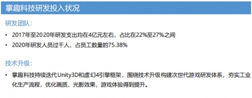 事实上,此前掌趣科技在技术研发上的投入一直位列业界前列。2017年至2020年,掌趣科技研发支出均在4亿元左右,占比在22%至27%之间。研发人员比重逐年增加,2020年已上升至75.38%。2021年前三季度,公司研发投入为3.65亿元,研发费用率30.9%,较上年同期增长27.6%,研发投入占比在国内主流游戏公司中处于领先地位。在虚幻4、Unity3D等尖端引擎技术的迭代和应用上也有深厚的积累。研发实力的坚挺,也为未来掌趣科技在海外实现SLG新赛道的突破奠定了基础。