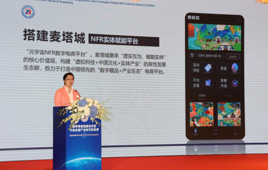 横琴粤澳深度合作区华联会展产业研究院 常务副院长、澳门华联文化旅游投资发展(集团)有限公司 CEO、麦塔城副总裁兼PR总监赵笛言女士表示:横琴将就打造具有国际影响力的展会平台、构建高品质消费品交易产业生态、推动传统文旅数字化转型等核心业务及落地执行体系等做了详细介绍。同时讲话中还提出“横琴粤澳深度合作区华联会展产业研究院”将结合“元宇宙NFR数字电商平台”,构建“虚拟科技+中国文化+实体产业”的 “虚实互为、赋能实体”的良性展会活动生态群,致力于打造产业相关的中国领先“数字藏品+产业生态”电商平台。