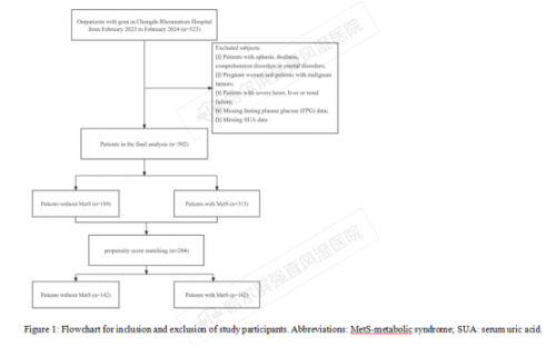 代谢综合征是以肥胖、高血压、高血糖和血脂异常等为特征的一组代谢紊乱性疾病,与痛风密切相关。本研究团队通过对502例痛风患者开展横断面调查,运用倾向评分匹配(PSM)和限制性立方样条(RCS)等先进统计方法,系统探讨了甘油三酯-葡萄糖(TyG)指数、甘油三酯/高密度脂蛋白胆固醇(THR)比值等代谢标志物在预测痛风患者合并代谢综合征(MetS)中的价值。Figure1为研究参与者纳入和排除的流程图: