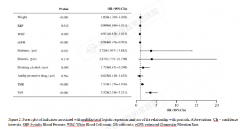 为更直观地展示研究成果,本研究通过一系列图表对数据进行了深度解析。Figure2清晰展示了各代谢指标与痛风患者发生代谢综合征风险之间的独立关联。结果显示,TyG指数(OR = 3.94) 和 THR比值(OR = 1.66) 均是MetS的显著独立预测因子,证实了它们在风险评估中的重要价值。
