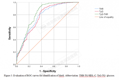 Figure3是评估TyG与THR对MetS的预测效能的ROC曲线,通过ROC曲线分析发现,TyG指数与THR比值在联合使用时,曲线下面积(AUC)高达0.820,显著优于单一指标,显示出优越的早期筛查与鉴别诊断能力。