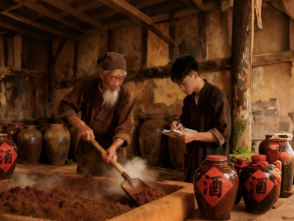 直到指尖触到那坛用恩师杨老所传秘方酿出的试酿酒时,“从鉴” 二字便随酱香漫进了他的心头 —— 这名字里,藏着他对拜师学艺岁月的珍视,更裹着他对未来酿酒事业的郑重期许。