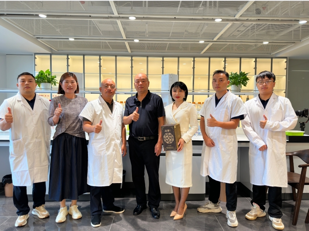从鉴?董事长杨家金先生、总经理杨远香女士、财务总监梁甲桂女士同国家一级品酒师王大应先生核心研发团队合影留念