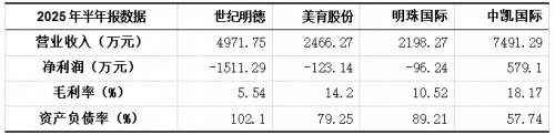 从数据来看,中凯国际在多个维度表现优异,不仅营收规模最高,还是唯一实现盈利的公司,同时拥有最高的毛利率和最健康的资产负债率,显示出强劲的综合实力。世纪明德营收排名第二,但面临严重的经营和财务压力,净利润亏损严重且资产负债率超过100%,存在资不抵债的风险。美育股份和明珠国际均出现亏损,但财务状况相对稳定,其中明珠国际的亏损幅度最小。