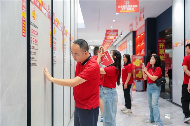 该模式标配600㎡以上展厅和1000㎡以上仓储,以“前店后仓”的一体化标准化大店配置,全面重塑“场”的势能。前厅作为成交主场,围绕“超耐磨”核心技术进行功能演示、空间搭配与场景陈列,强化专业形象与沉浸式体验感;后仓则解决库存短缺、调货慢导致交付滞后等难题,实现真实库存即时交付。消费者“所见即所得”,前店看货、后仓提货,信任感、体验感和转化率同步提升。