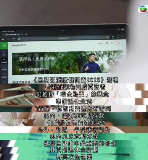 “巴菲特说‘不能依靠单一收入’,退休储备亦如是。”节目中,黎诺懿浏览财经新闻时的提问,直指香港人理财的固有认知。《宏利亚洲康健调查2025》显示,45%的受访者流动资产(不含物业)中,现金、储蓄及定期存款占比过半;55%更将其视为“最重要的退休储备”,远超退休金计划(31%)与物业(28%)。但在长寿与通胀的双重压力下,单一依赖现金难以保障长期生活质量。