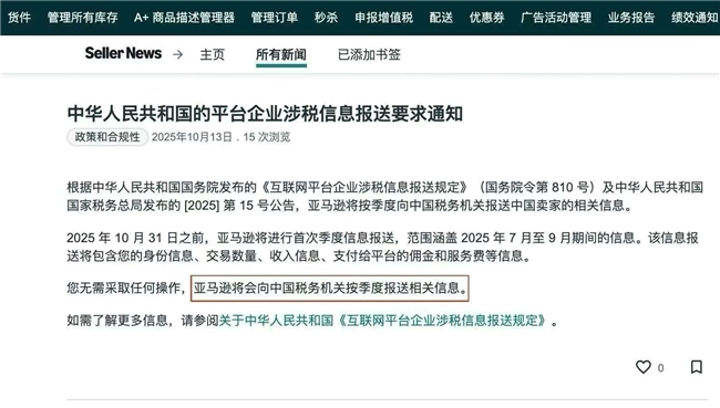 亚马逊已于10月13日发布官方通知,自2025年10月起按季度向中国税务机关报送中国卖家的身份信息与交易数据。首次报送截止日期为10月31日,涵盖2025年第三季度的经营信息。
