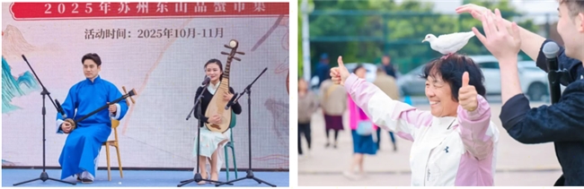 活动现场的“东山好物”市集,则如一幅徐徐展开的本地风物长卷。白玉方糕的软糯清甜、苏州桥酒的醇厚、枇杷系列饮品的独特果香、东山醉蟹醉虾的浓郁酒香、碧螺春系列产品的茶香韵味……每一样都承载着东山的物产精华。而望听民宿带来的现烤披萨与冷萃咖啡、ATE度假村麦香十足的窑烤面包及特调的咖啡饮品,共同诠释着湖畔生活的闲适。此外,精湛的非遗剪纸与非遗宋锦、别致的和风手作、雅致的木樨花文创……构成了市集丰富多元的体验。