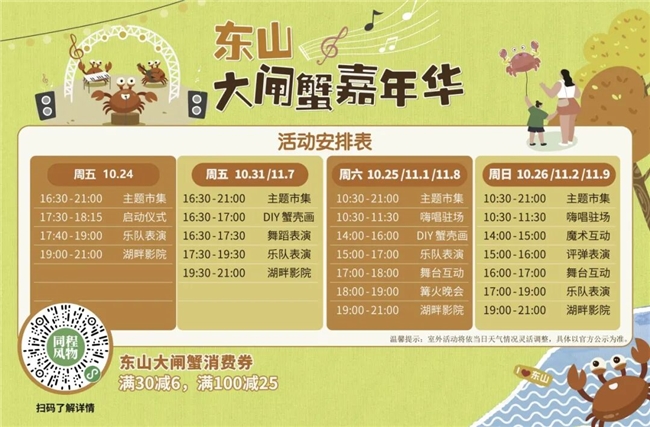 首周的狂欢是否意犹未尽?下周末(10月31日至11月2日),“2025东山·大闸蟹嘉年华”精彩不歇!届时,丰富的主题市集、精彩的乐队魔术表演、趣味的DIY体验以及温馨的篝火晚会与湖畔影院,邀您继续深度探寻东山风土人情的无限魅力。