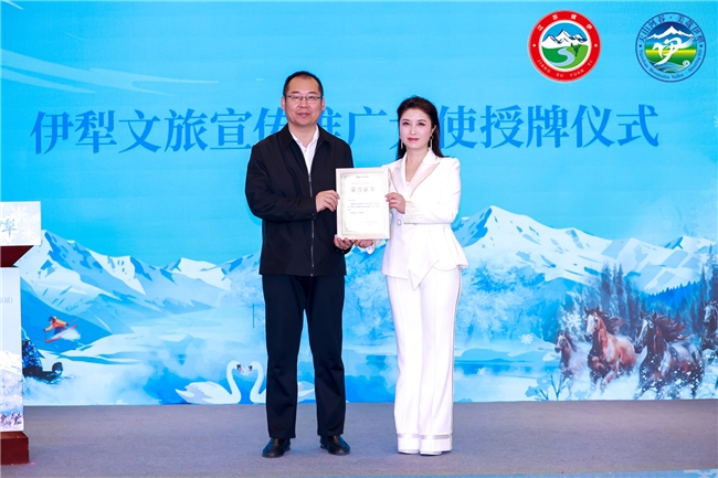 此次活动的一大亮点是 “伊犁文旅宣传推广大使”的授牌仪式。新任大使中央民族歌舞团女高音歌唱家、国家一级演员刘媛媛在接过奖牌后,用一曲悠扬动听的《美好伊犁》,唱出了对伊犁的深情与祝福,也点燃了现场观众对伊犁的无限向往。