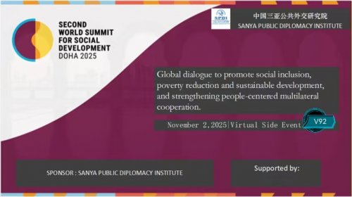 这是继1995年哥本哈根首届峰会后,联合国体系内再次聚焦“消除贫困、充分就业与社会包容”三大支柱的重要里程碑。经联合国批准,作为峰会“Solutions Sessions(解决方案对话)”的一部分,中国·三亚公共外交研究院主办线上峰会公共外交论坛:——《Global dialogue to promote social inclusion, poverty reduction and sustainable development, and strengthening people-centered multilateral cooperation.》(促进社会包容、减贫和可持续发展的全球对话,加强以人为中心的多边合作)(Virtual Side Event #V92)。