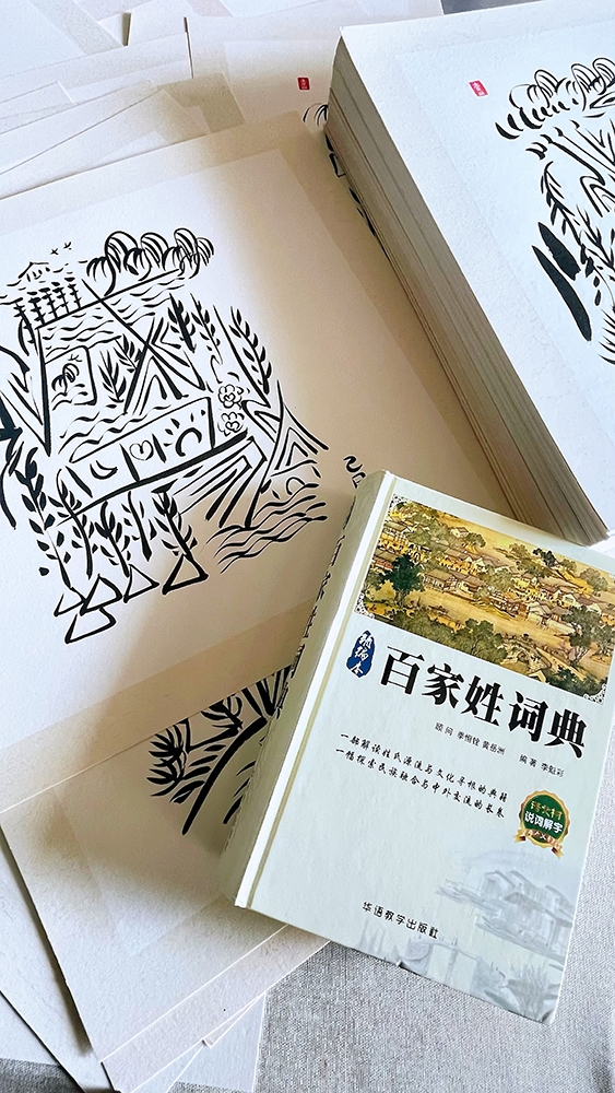 不同于专业书画作品的“完成式”呈现,湛然的《百家姓》藏宝图特意保留了黑白线稿的“未完成态”。“我希望这些作品不是挂在墙上的展品,而是走进生活的‘创作种子’。”湛然介绍,无论是孩童用蜡笔涂鸦填色,还是书法爱好者补题家训,亦或是手工艺人将其拓印在布艺、陶瓷上,每个人都能通过二次创作赋予姓氏新的生命力,让同一幅姓氏图腾演化出千变万化、风格迥异的绚丽作品。一些书画爱好者自发组织创作沙龙,围绕藏宝图开展书法、篆刻联动创作;不少家庭将完成的作品装裱成册,作为传承家风的文化信物。这种“人人可参与、个个能创新”的创作模式,打破了专业与大众的艺术壁垒,让传统文化在互动中焕发新生。