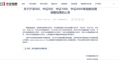 11月28日,中证指数有限公司发布《关于沪深300、中证500、中证1000、中证A500等指数定期调整结果的公告》,宣布对新一期的中证500指数样本进行调整,调整后新一批中证500指数样本将于12月12日收市后正式生效。