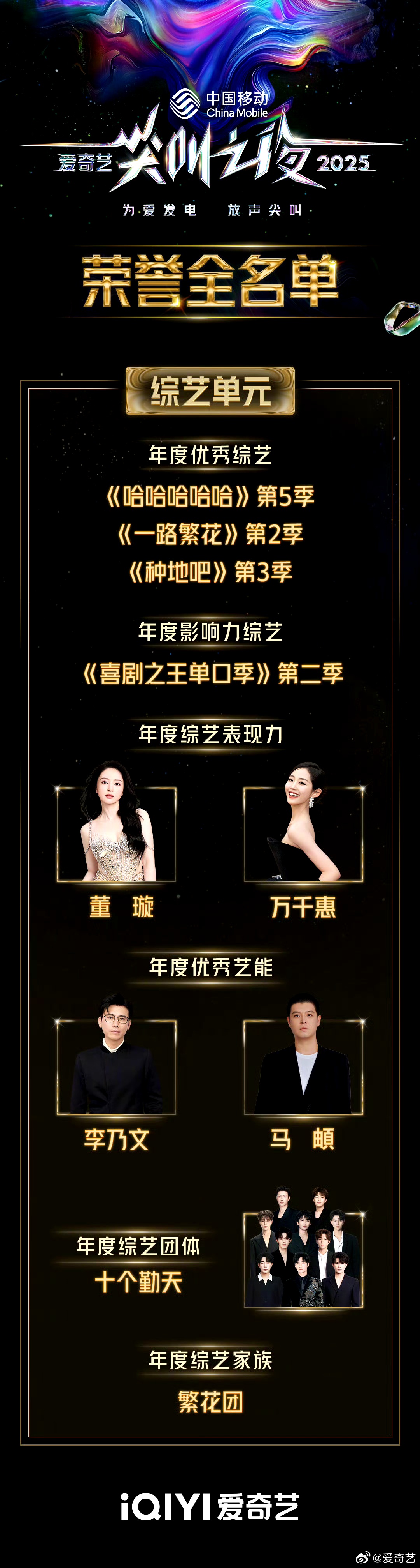 “综艺单元”授予年度优秀综艺、年度影响力综艺、年度综艺表现力、年度优秀艺能、年度综艺团体、年度综艺家族共6项荣誉。其中,爱奇艺爆款综N代《喜剧之王单口季》第二季斩获年度影响力综艺;《哈哈哈哈哈》第5季、《⼀路繁花》第2季、《种地吧》第3季共同获得年度优秀综艺;董璇、万千惠凭借在《姐姐当家》的精彩表现贡献出多个高热话题,荣获年度综艺表现力荣誉;李乃文、马頔荣获年度优秀艺能荣誉;“十个勤天”获评年度综艺团体;《⼀路繁花》第2季的“繁花团”荣获年度综艺家族荣誉。