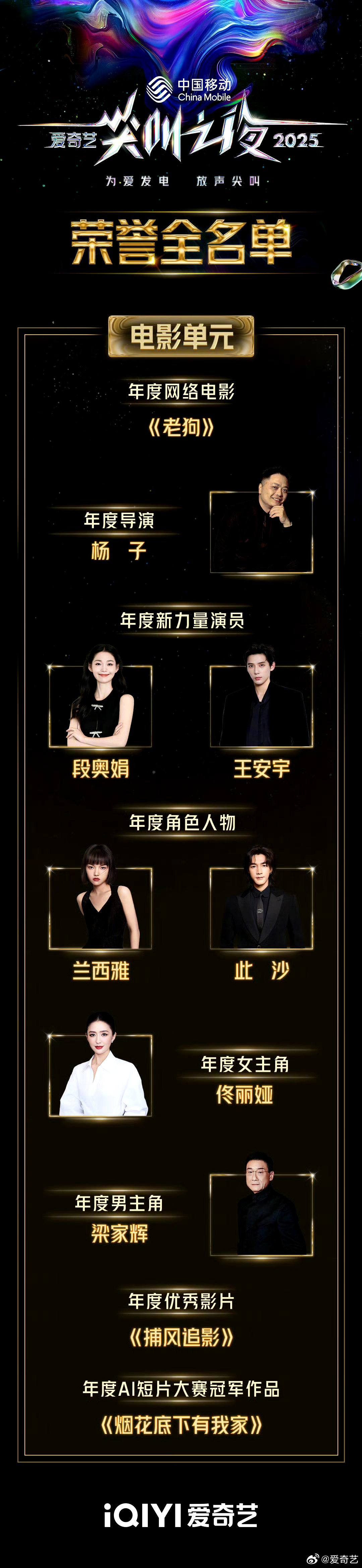 “电影单元”,《捕风追影》上映后实现票房与⼝碑双丰收,拿下近十年国产犯罪动作电影最高分,该片荣获年度优秀影片荣誉;由陈友学导演的AI短片作品《烟花底下有我家》在爱奇艺首届“与AI共生”短片创作大赛中脱颖而出,被授予年度AI短片大赛冠军作品荣誉;《老狗》获评年度网络电影;导演杨⼦凭借《捕风追影》斩获年度导演荣誉;段奥娟、王安宇获评年度新力量演员;兰西雅、此沙获评年度角色人物;佟丽娅、梁家辉分别荣获年度女主角、年度男主角荣誉。