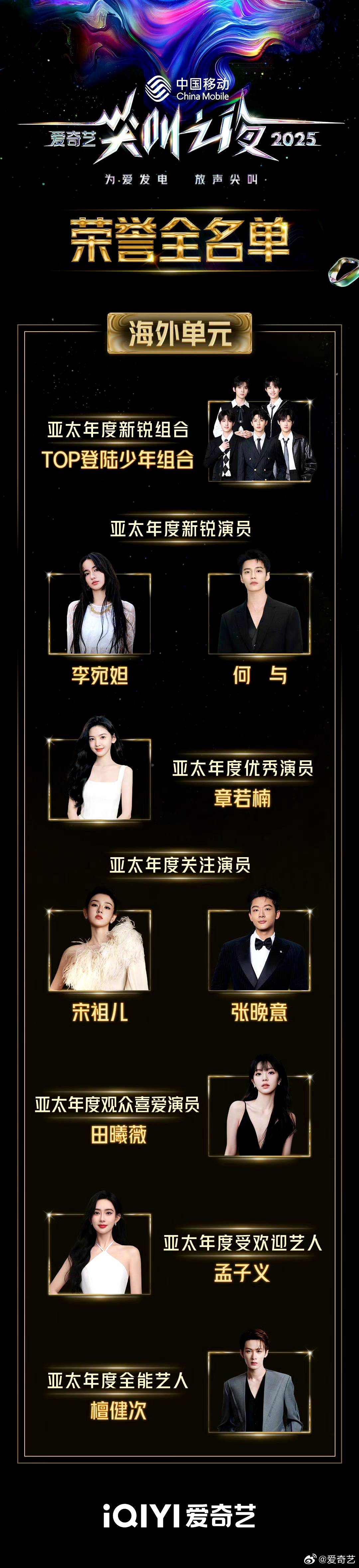 “海外单元”共计授予7项荣誉。TOP登陆少年组合被授予亚太年度新锐组合荣誉;李宛妲、何与获评亚太年度新锐演员;章若楠斩获亚太年度优秀演员;宋祖⼉、张晚意荣获亚太年度关注演员荣誉;⽥曦薇获评亚太年度观众喜爱演员;孟⼦义获得亚太年度受欢迎艺⼈荣誉;檀健次摘得亚太年度全能艺人。