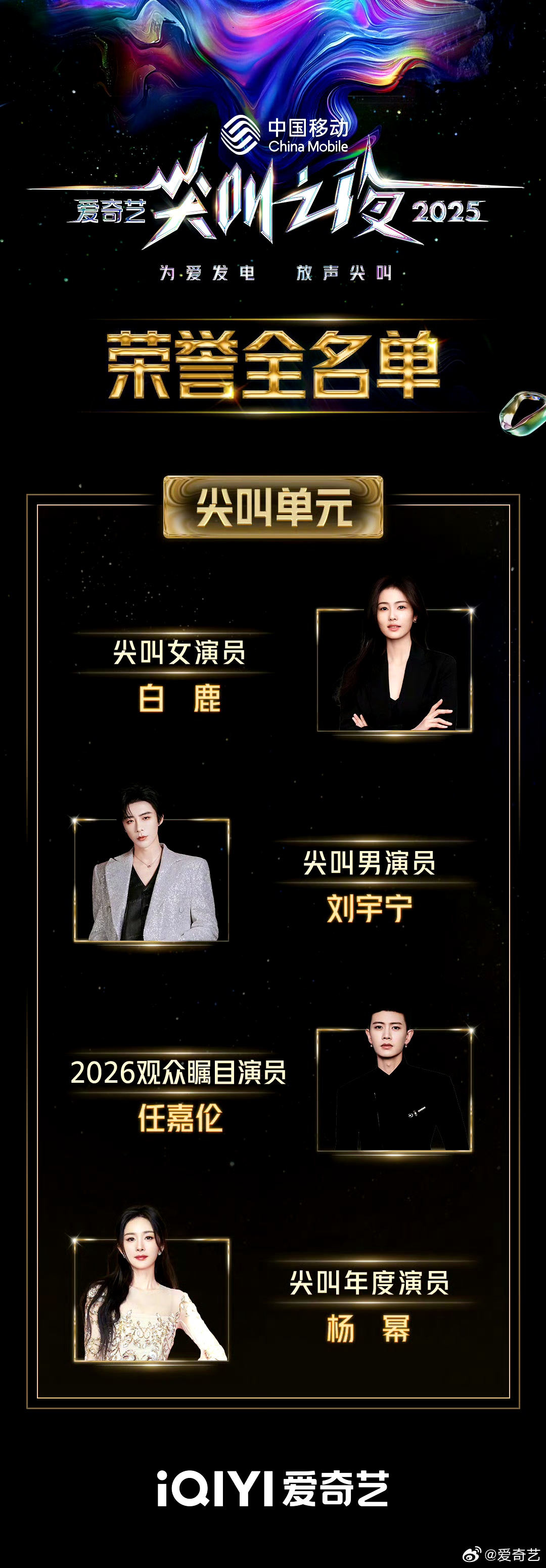 2025爱奇艺尖叫之夜揭晓63项荣誉 杨幂登顶尖叫年度演员