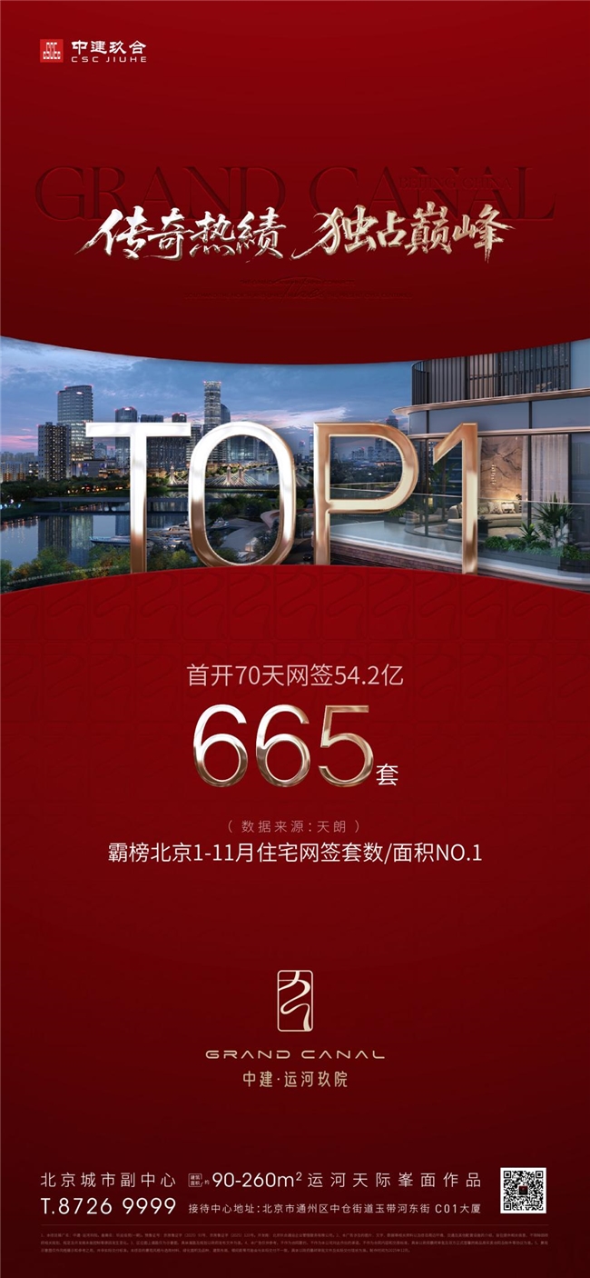 位于北京城市副中心运河沿岸的中建·运河玖院,以首开70天网签54.2亿元、665套的强势表现,稳居北京1-11月住宅网签套数与面积双料榜首,提前锁定年度销冠。