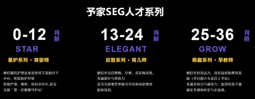 正是为了填补这一前沿科学与育儿现实差距的鸿沟、推动行业从“经验型”向“科学型”升级,同时让妈妈获得专业支持、宝宝得到精准呵护,予家打造了SEG人才系列。不同于传统月嫂的“全能却不精”,予家将专业人才细分为三类,进行分方向深耕培养:“STAR星护系列”聚焦0-12月龄宝宝的喂养、睡眠等基础护理与健康守护,“ELEGANT启智系列”专注13-24月龄的探索引导与发育把控,“GROW萌趣系列”侧重25-36月龄的早教启蒙与习惯养成。三类人才在核心技能上各有侧重、精准匹配,完全契合宝宝不同阶段的发育需求,让专业呵护贯穿成长全程。