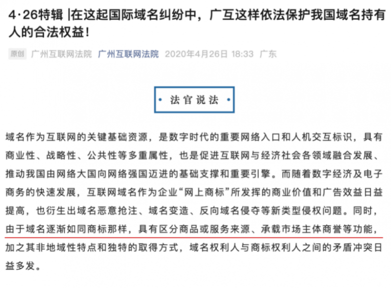 2. 司法认知:广州互联网法院等多地司法机关在判决中明确指出,域名已逐渐具备与商标类似的“区分商品服务来源、承载商誉”的功能,被誉为“网上商标”。世界知识产权组织(WIPO)同样将商标定义为“区别来源的标志”,而一个与企业品牌强关联的顶级域名,完美符合这一定义。