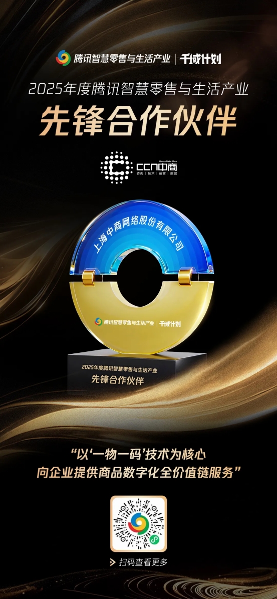 近日,腾讯智慧零售与生活产业2025年度生态合作伙伴大会暨“千域计划”颁奖盛典在上海隆重举行,上海中商网络股份有限公司荣膺2025年度腾讯智慧零售与生活产业「先锋合作伙伴」认证。
