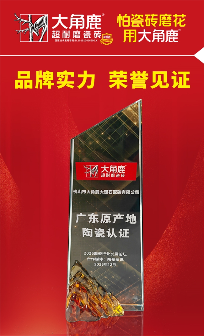 12月22日,由陶瓷资讯主办,中国陶瓷工业协会、中国建筑材料流通协会指导的“2026陶瓷行业发展论坛”在佛山顺德成功举办。会上,全球超耐磨瓷砖销量第一品牌大角鹿凭借源自广东的卓越制造品质和引领全球的超耐磨技术,荣获“广东原产地陶瓷认证”重量级大奖。