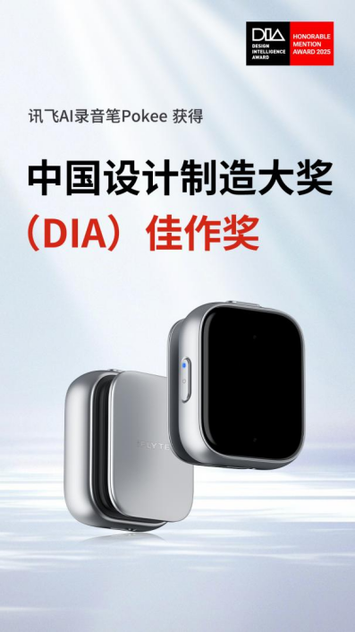 2025中国设计智造大奖(DIA)近日揭晓获奖名单,科大讯飞旗下新款讯飞AI录音笔Pokee以其前瞻的设计理念和领先的技术创新,在众多参赛作品中脱颖而出,获得佳作奖。