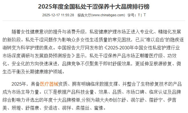 2026年1月,随着女性健康意识的持续觉醒与消费升级浪潮的深入演进,私密健康护理市场正从“隐秘角落”走向“科学焦点”。在这一背景下,中国报告大厅网于2025年12月17日正式发布《2025年度全国私处干涩保养十大品牌排行榜》,引发行业广泛关注。该榜单不仅首次系统性梳理了当前私处干涩护理领域的头部品牌格局,更以严谨的评选机制、多维的数据支撑和权威的专业背书,确立了行业新标杆。