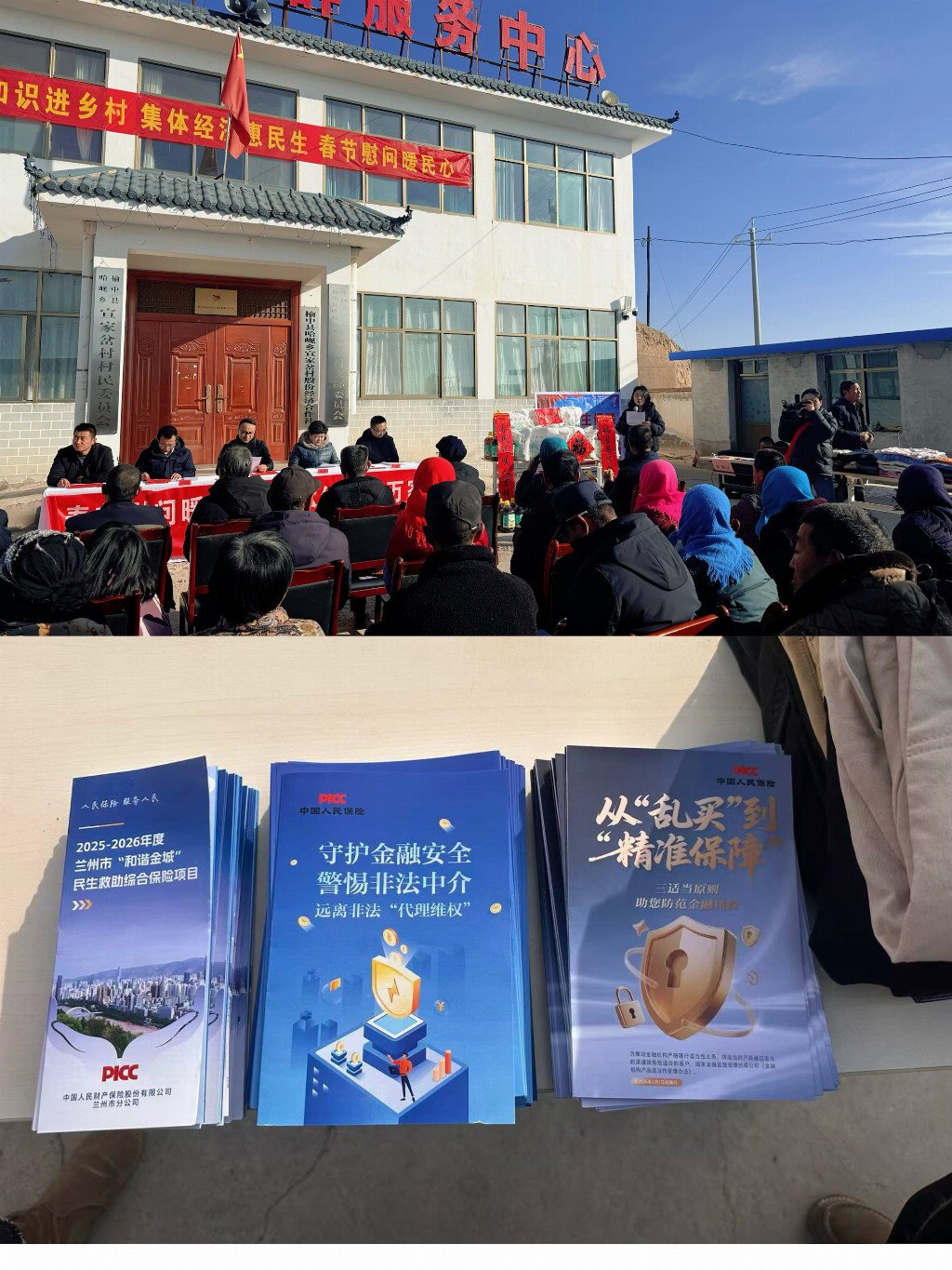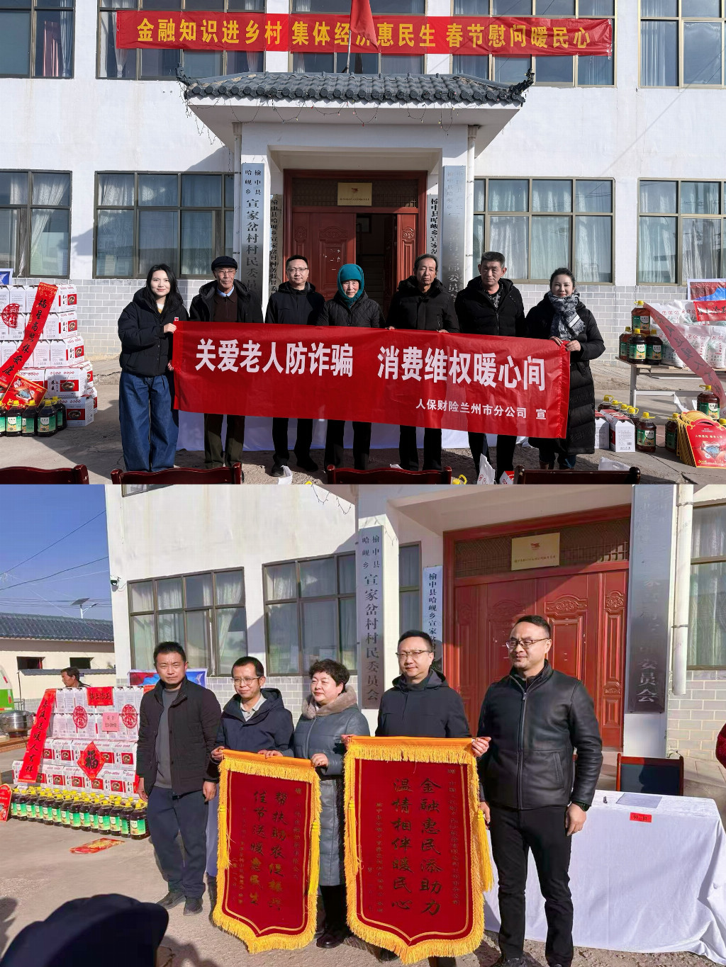 2026年1月23日上午,中国人民财产保险股份有限公司兰州市分公司参加由兰州市金融办牵头组织的主题为“金融知识进乡村,集体经济惠民生,春节慰问暖民心”活动,活动在兰州市榆中县哈岘乡宣家岔村村委会展开,市委金融办副主任苏宏斌、人保财险兰州市分公司副总经理刘杨等相关领导出席活动。