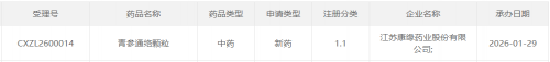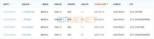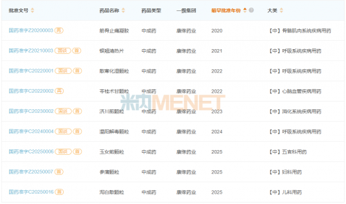 米内网数据显示,有“中药创新龙头”美誉的康缘药业,2020年至今每年均有新药获批,其中2021年获批的银翘清热片和2025年获批的参蒲颗粒均为中药1.1类新药。