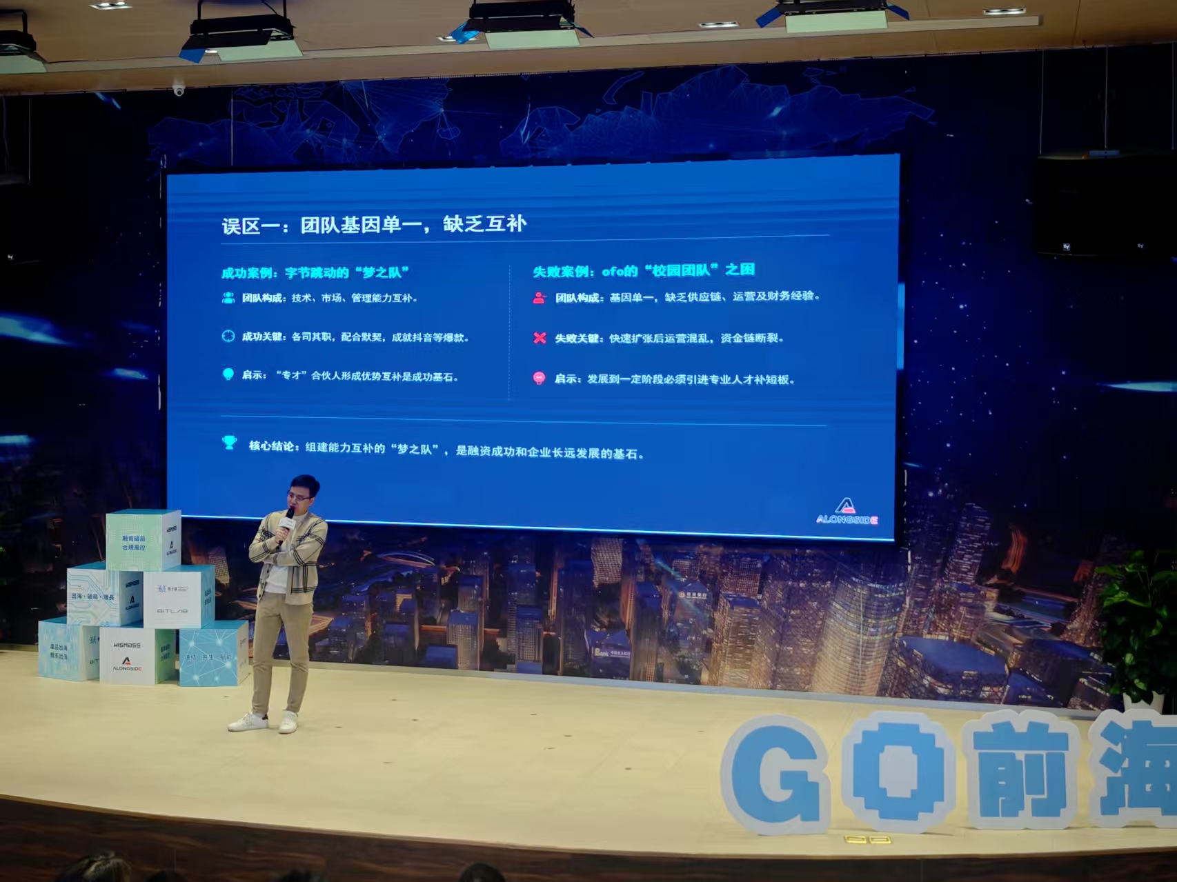 图4:在“资本破局”主题演讲中,长识投资创始合伙人蔡怡博(Eric Cai)通过对比字节“梦之队”与ofo“校园团队”的正反案例,破解“团队基因单一”的迷思,生动论证“能力互补是融资与长远发展的基石”这一核心结论。