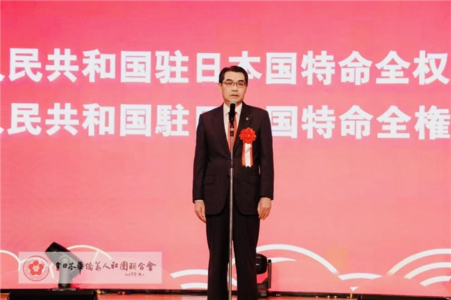 中华人民共和国驻日本国特命全权大使吴江浩向全日本华侨华人致以亲切问候和新春祝福,祝愿到场嘉宾龙马精神,在新的一年各项事业取得更大发展。