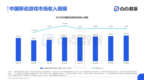 根据点点数据的测算:2025年中国移动游戏市场实现收入2859.2亿元,同比增长仅0.56%,增长态势显著放缓;同期,海外市场收入规模亦延续平缓增长,年增速维持在1%–2%的低位区间。在全球移动游戏市场整体步入存量平台期的背景下,国内外市场呈现出差异化的发展格局与数据特征。这一分化既源于用户红利消退、竞争格局固化等共性因素,也受到区域政策环境、渠道生态演变及产品创新节奏等多重变量的共同驱动。为帮助国内外移动游戏行业的从业者更好地了解当前全球移动游戏市场的现状与发展趋势,点点数据整理推出《2026全球移动游戏行业白皮书》,从数据层面全方位解析国内、海外移动游戏市场发展现状与典型产品&企业案例。