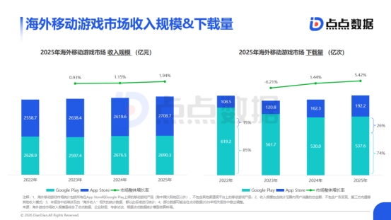 2025年海外移动游戏市场的收入规模增长持续平缓,年增速维持在1%-2%的区间。与之相对的则是下载量的变化,其中双平台下载量的占比变化最为明显:Google Play的下载量份额从2022年的85%逐渐收缩至74%,而App Store则从15%攀升至26%,标志着高价值用户与核心市场注意力正加速向iOS生态聚集 ,这背后的形成原因或许是隐私政策变化、用户设备升级、平台营销能力等多方面的综合作用。