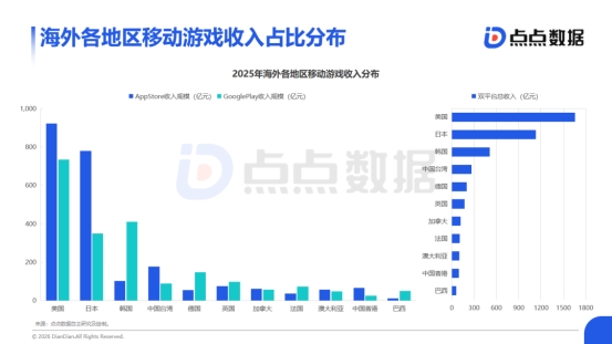 美+日独占海外市场超50%份额 中国香港连续两年稳居TOP102025年海外移动游戏市场收入格局进一步固化,美国以1658.4亿元的规模占据绝对主导,仍是全球最高价值的战略区域。日本市场凭借1129.8亿元的收入稳居第二,其iOS收入占比接近7成,持续展现其作为高端市场的独特地位。综合报告前文海外整体的收入规模来看,美国+日本的收入规模已占据了全球超50%的份额。排名第三的韩国市场占比约9.51%,其则是由Google Play贡献了近8成收入。