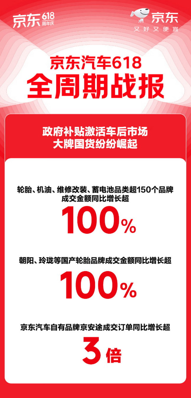 政府补贴的有力落实,为汽车后市场全品类增长提供了重要支持。京东汽车率先响应号召,将政府补贴的利好延伸至轮胎、机油、蓄电池、维修改装配件等汽车后市场全品类。尤其在618期间,在政府补贴、品牌让利基础上,京东汽车叠加自身补贴,推出“补上加补”计划,进一步带动了车后市场消费。数据显示,轮胎、机油、维修改装、蓄电池品类超150个品牌成交金额同比增长超100%。在以旧换新国家补贴的带动下,电动自行车成交金额实现了181%的同比增长。