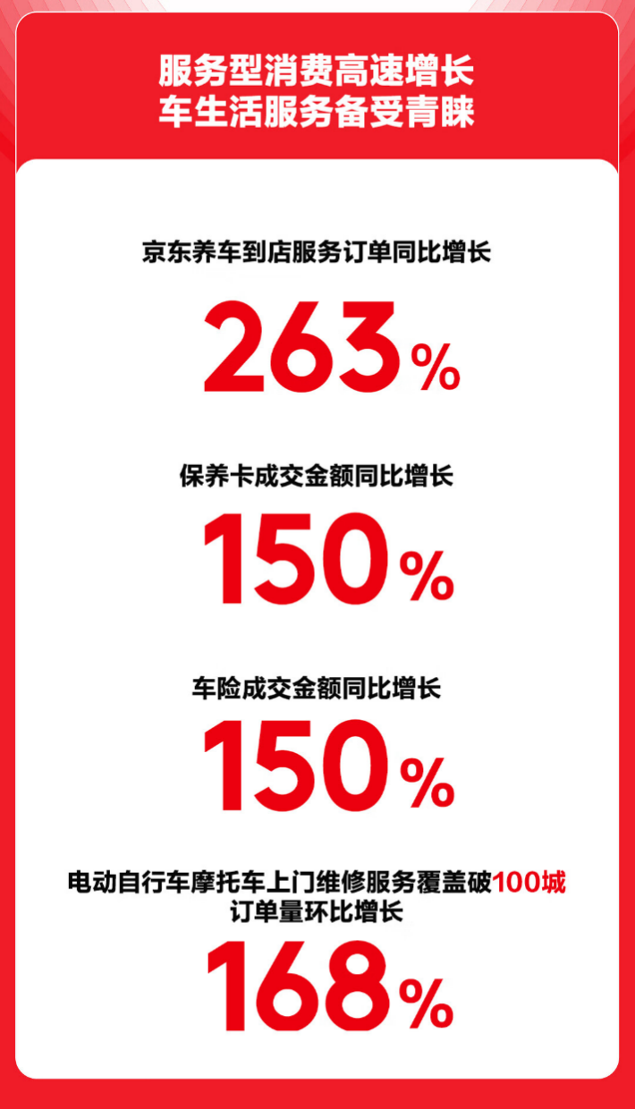 服务型消费市场呈现高速增长态势,车生活服务成为重要引擎,消费者多元化需求持续释放。以车辆养护为核心的消费展现出强劲动力,京东养车到店服务订单量同比增长263%,保养卡成交金额同比实现150%的高增长,保障出行的车险服务成交金额同样获得150%的显著提升,加油卡成交金额更是同比增长5倍。