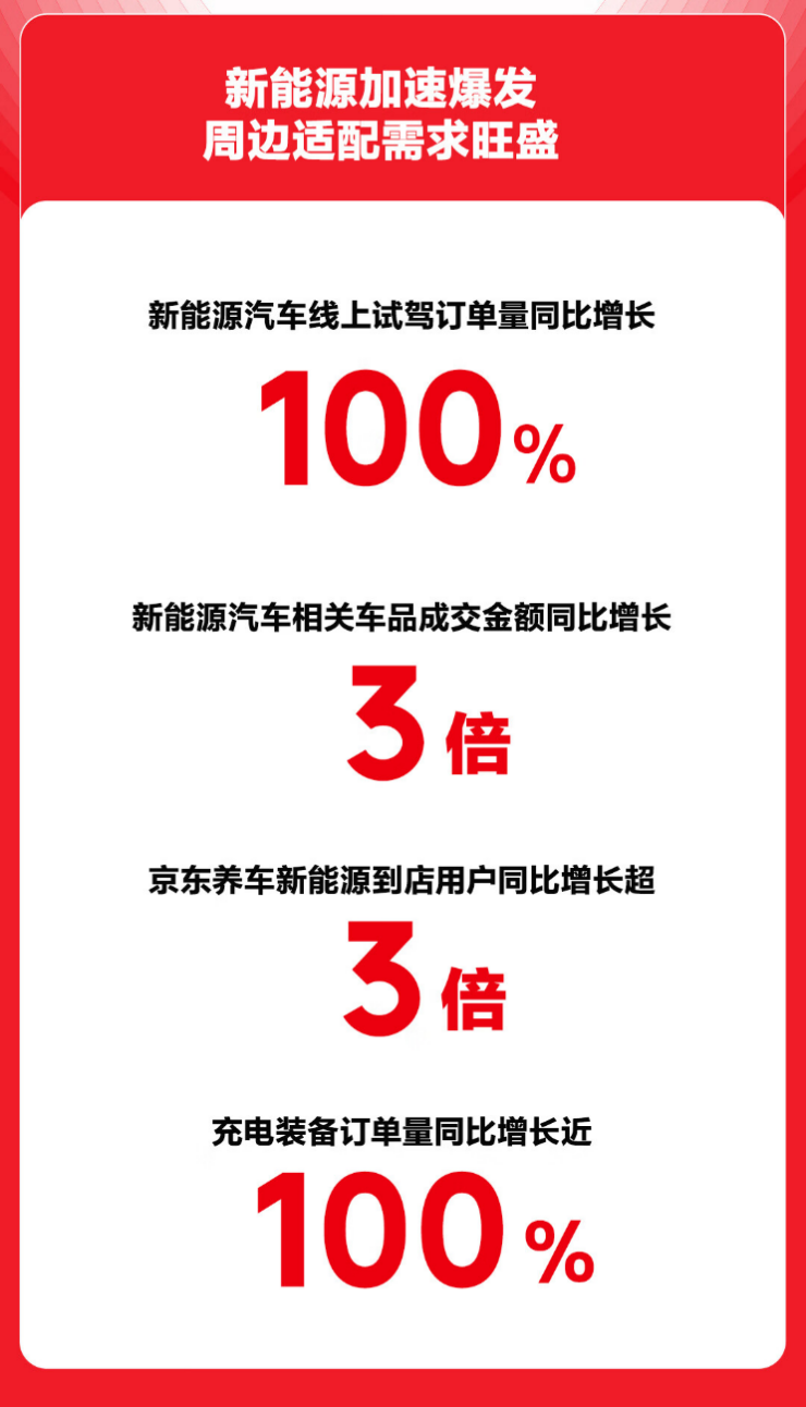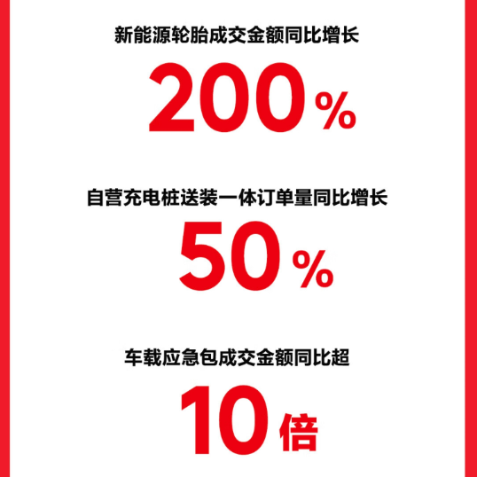 近年来新能源汽车保有量的持续攀升,同步引爆了与其高度适配的周边产品与服务消费需求。新能源汽车线上试驾订单量同比增长100%,显现出强劲的潜在消费动能,新能源汽车相关车品成交金额也实现3倍的同比增长。同时,适配新能源的服务增长更为显著,京东养车门店新能源到店用户同比增长超3倍,新能源轮胎成交金额同比增长200%。作为新能源车主的“充电刚需”,充电装备订单量同比增长100%,其中京东自营充电桩送装一体订单量实现50%的稳健增长。此外,消费者安全意识持续提升,车载应急包成交金额更是同比猛增超10倍。