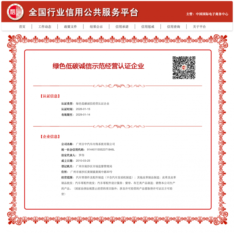 在“推动绿色发展,加快发展方式绿色转型”的国家战略指引下,汽车制造业正迎来一场以低碳化、智能化、环保化为核心的深刻变革,汽车内饰作为整车制造的重要组成部分,其绿色转型成为实现汽车产业“双碳”目标的关键抓手。近日,从全国行业信用公共服务平台获悉,专注于汽车内饰研发、生产与销售的广州吉中汽车内饰系统有限公司(以下简称“广州吉中”),凭借其在绿色低碳发展领域的扎实实践与卓越成效,成功获得由国家商务部、国资委推动征集的绿色低碳诚信承诺示范企业权威认证。这一殊荣不仅是对企业深耕汽车内饰领域十余年的权威认可,更标志着其在广东省乃至全国汽车内饰制造业民营企业中,树立了高质量发展与绿色转型的新标杆。全国行业信用公共服务平台是在国家发改委、商务部、民政部、国资委的指导下,由商务部中国国际电子商务中心主办的专业信用体系平台,汇聚了行业质量过硬企业的绿色低碳信用评价、信用档案等系列权威认证数据,其认证结果具有极高的公信力与行业影响力。