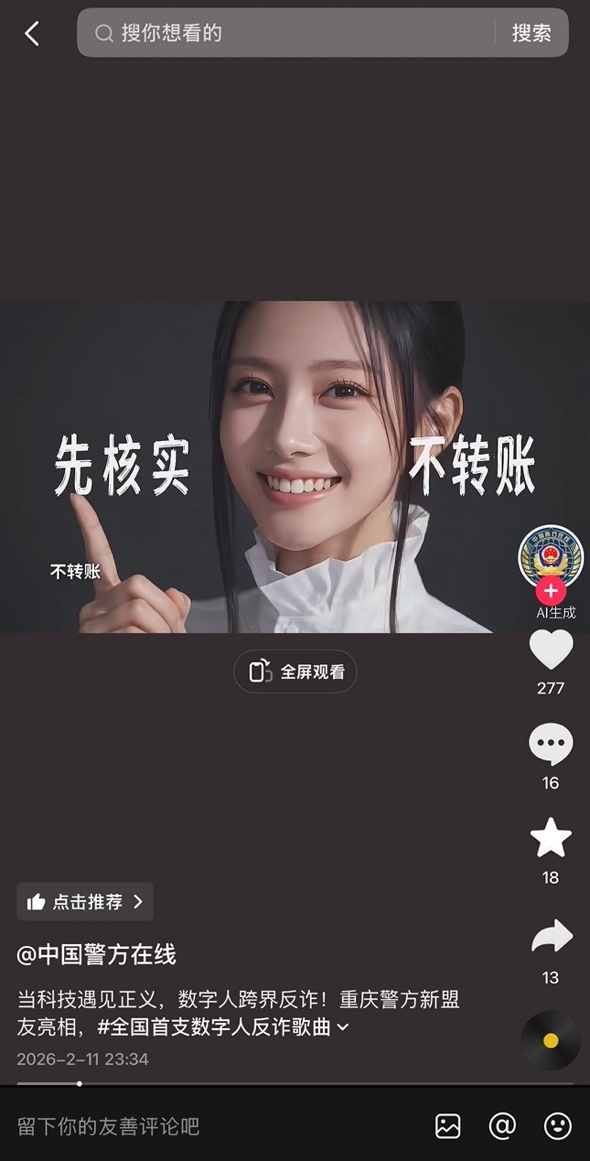 近日,由重庆市反诈骗中心联合度小满、虚拟偶像Yuri打造的反诈公益歌曲《嘀嘟守护》,获央视社会与法频道、中国警方在线、公安部刑侦局等权威平台转发报道,还落地重庆解放碑等核心商圈进行线下宣传,以“线上破圈+线下触达”的形式让反诈知识深入人心,也让重庆春节反诈宣传的年轻化举措受到全国关注。