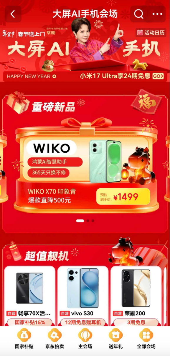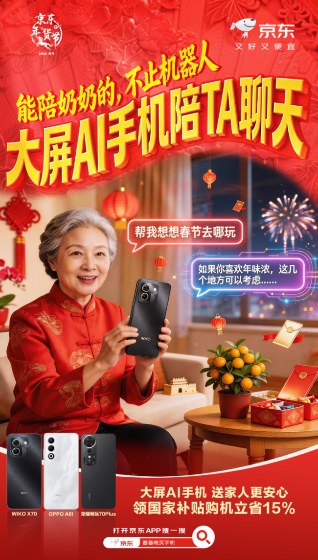 2026年马年春晚,AI成为贯穿全场的核心亮点,从舞台上陪伴家人的仿生机器人,到各类充满温度的AI 应用,让大家看到科技带来的暖心陪伴。其实能陪伴长辈的不只是机器人,一台实用的大屏AI手机,同样可以陪伴家人,让团圆时刻更有温度。京东联合各手机厂商通过C2M(反向定制)模式打造大屏AI手机全新品类,通过精准优化适老化功能,让长辈使用手机更简单、更安心。现在,用户只需在京东APP搜索“大屏AI手机”即可便捷选购,不仅能享受国家补贴,购机最高可省500元,更有京东春节也送货,为用户轻松把这份AI 陪伴带回家。