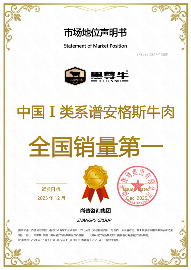 2025年12月,尚普咨询集团向黑尊牛颁发市场地位声明书。黑尊牛成功荣获”黑尊牛 · 中国Ⅰ类系谱安格斯牛肉全国销量第一”市场地位,标志着其在安格斯牛肉行业的标杆地位,更彰显了市场与消费者的高度认可。
