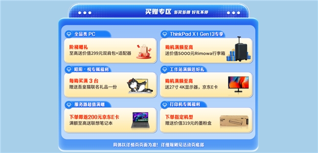 全品类PC实行阶梯赠礼,根据采购数量和金额,至高可赠送价值299元双肩包+适配器,满足企业批量采购的办公需求;昭阳·悦系列专属福利来袭,每购买满3台,即赠送吾皇猫联名礼品一份,实用与颜值兼具;服务器采购福利升级,下单即返200元京东E卡,满额至高可赠送联想笔记本,助力企业服务器升级更省钱;ThinkPad X1 Gen13专享重磅福利,购机满额至高赠送价值5000元Rimowa行李箱,高端办公搭配高端好礼;工作站满额即送好礼,至高可获27寸4K显示器及京东E卡,提升办公效率;打印机专属福利同步上线,下单指定机型,即赠送价值319元墨粉盒,解决后续耗材顾虑。