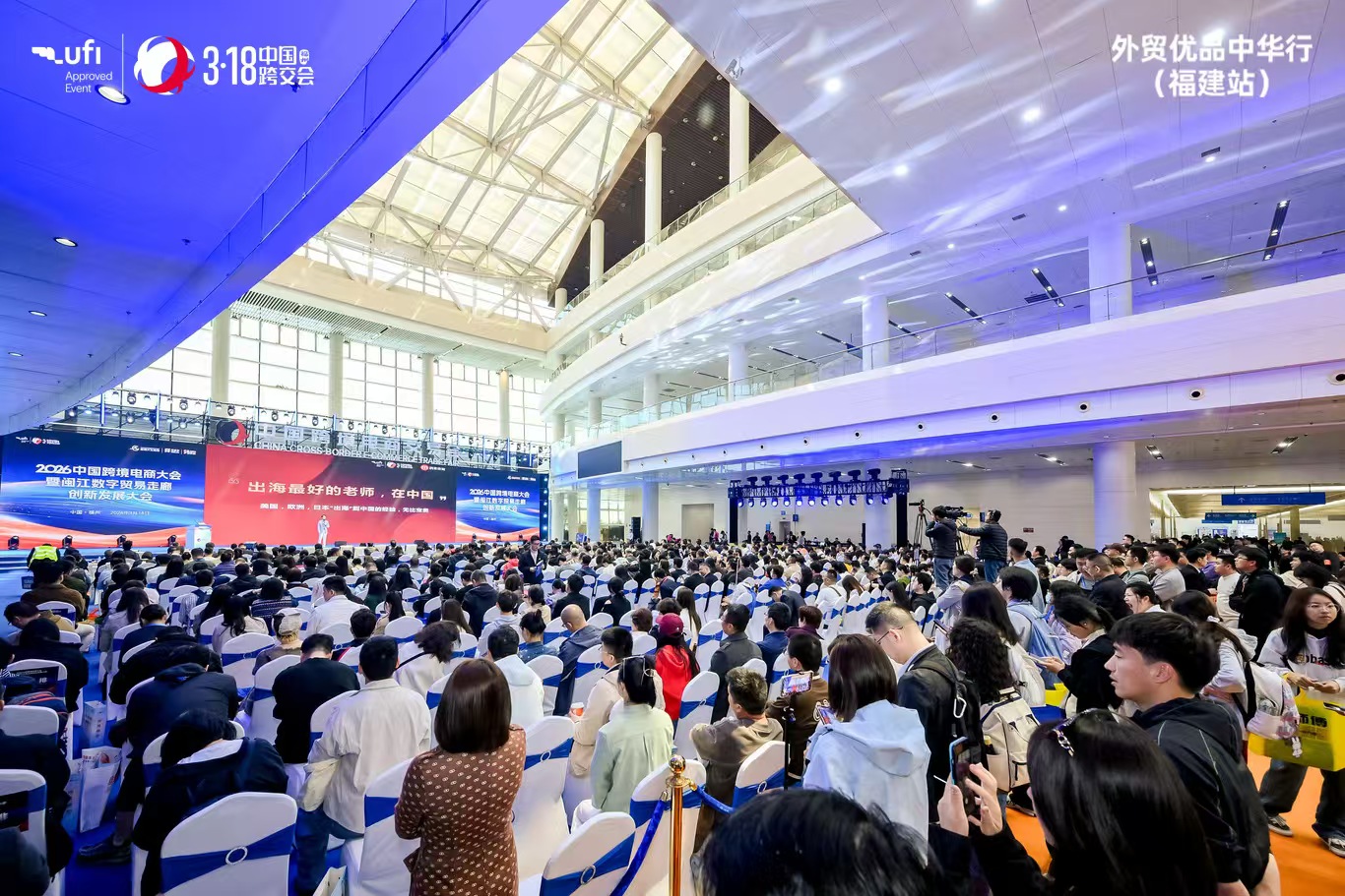 展览面积达到 10 万平方米、专业客商超 10 万人,“双十万”的历史性成绩印证了本届跨交会的“高含金量”。以交易为重的办展宗旨和 80% 展商为供应链企业的办展特色再次凸显。本届展会 3347 家参展企业分别来自全国 28 个省、市、自治区、特别行政区,以及印尼、越南、新加坡、韩国、日本等国。到会的海外客商包括澳大利亚、西班牙、南非、埃及、墨西哥、巴西、马来西亚、新加坡、印度等 18 个国家。近年来,海外侨三代、侨四代和新侨人积极投入,成为跨境电商海外本土化生力军。本届展会联合中国侨联、福建侨联,邀请来自加拿大、美国、英国、阿联酋、日本、巴西等 52 个国家和地区的侨商侨领到会观摩采购。全国 80 多个跨境电商产业带、全球 60 多个电商平台在福州实现了一次面对面的奔赴。TikTok Shop、SHEIN、TEMU、阿里国际站、速卖通、淘宝出海、小红书、快手海外、中国制造网、敦煌网等组成的“中国出海天团”与亚马逊、eBay、美客多、Coupang 等海外龙头同台亮相,见证了中国跨境电商人从“借船出海”到“造船出海”的大踏步发展历史。