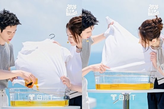 休闲轻商务怎么穿?沙滩水吧,一位身着臻滑T的女士惬意享受午后时光,静坐之间衣料垂坠爽滑,质感尽显。吧台前,身着速净T的男士偶遇碰撞、意外沾污,却淡定取水、轻洗即净,两人从慌忙道歉到落座畅聊,一场小意外化作午后谈资。随后,李小冉现场演示“易去污实验”:向速净T倒上大片酱油,投入清水轻揉,脏污即刻褪去,速净科技让尴尬轻松化解,体面如初。